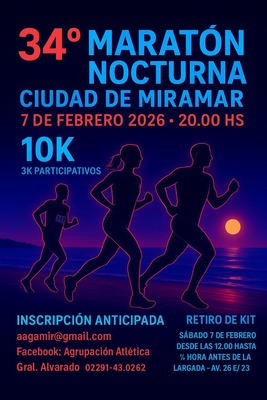 📆Domingo 7 de Febrero 2026📍Av. 26 y 23, Miramar 🕐 Largada: 20hs🏃🏿Distancias: 10K Competitivos / 3K Participativos [email protected]: Asociación Atlética Gral Alvarado ACREDITACION📆Sábado 7 de Febrero🕛12 a 19hs